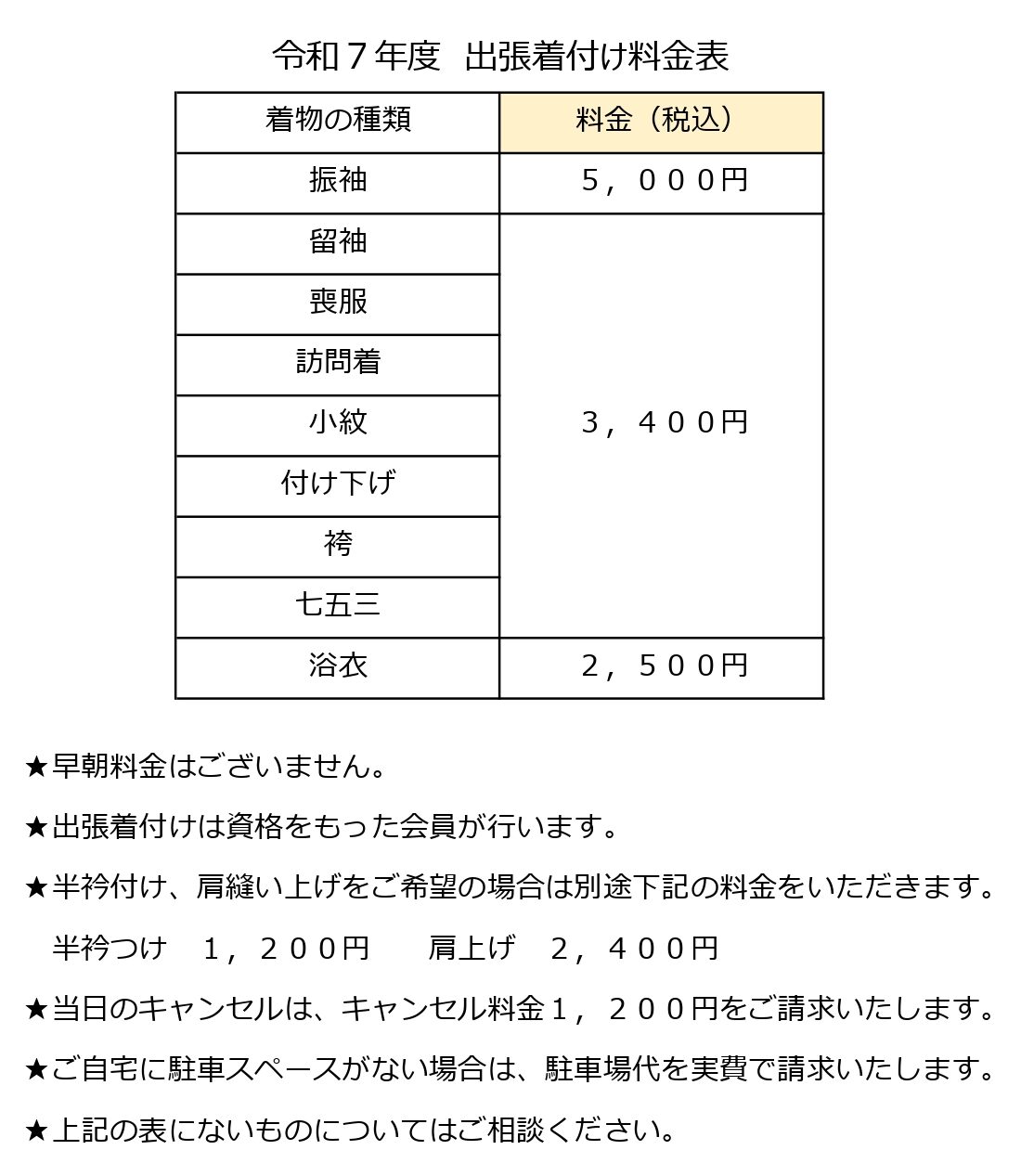 ※以下、出張着付け料金表のとおりです。